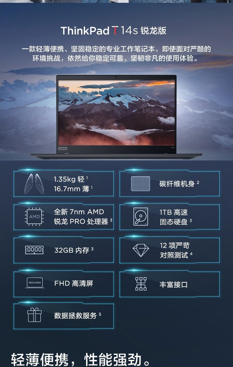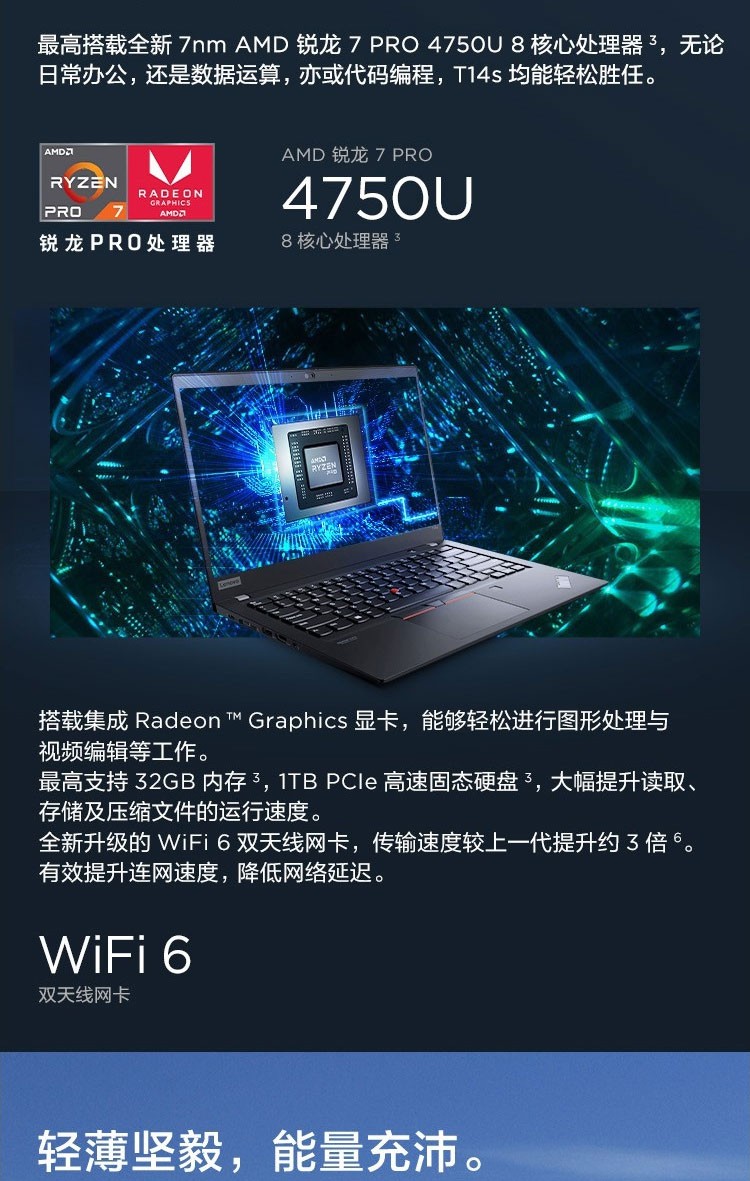 联想ThinkPad T14s AMD锐龙八核14英寸碳纤维轻薄高性能办公笔记本电脑 T14s 08CD:R7 PRO-4750U/16G/512 FHD全高清 指纹识别 Win10 WiFi6