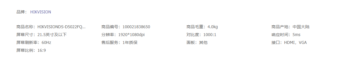 海康威视HIKVISION 22英寸1080P窄边框低功耗显示器D5022FQ-NA多接口全天候监控器台式机电脑显示屏