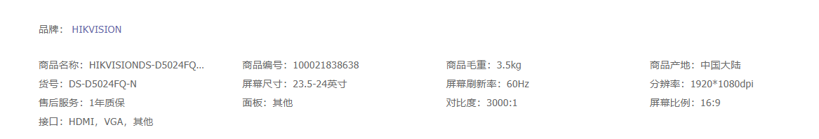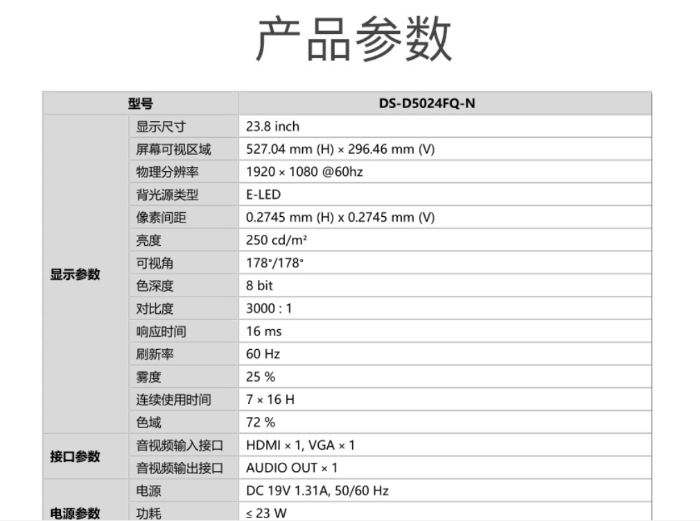 海康威视HIKVISION 24英寸显示器低功耗多接口全天候监视器D5024FQ-N台式机电脑监控显示屏1080P高清屏幕